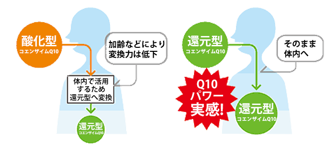 体内に存在するコエンザイムQ10の大半は“還元型”!従来からある“酸化型”のコエンザイムQ10がパワーを発揮するためには、一度体内で“還元型”に変換(還元)される必要があるのですが、体内での変化力は加齢とともに衰えていくので実感されにくくなります。