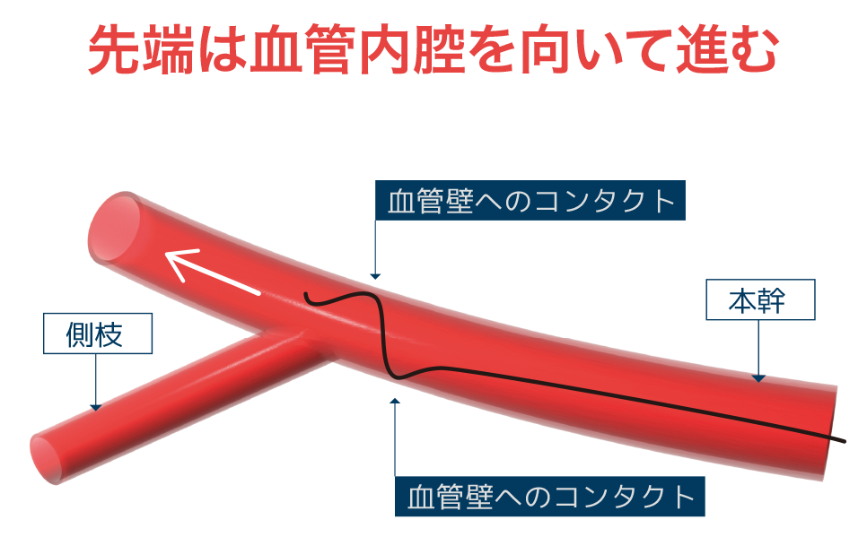 血管径が比較的小さな動脈に対しては、くねったように走行していきます。スワンの2つのカーブが互いに血管壁に接触しながら、先端を内腔へ向かせ進んでいきます。